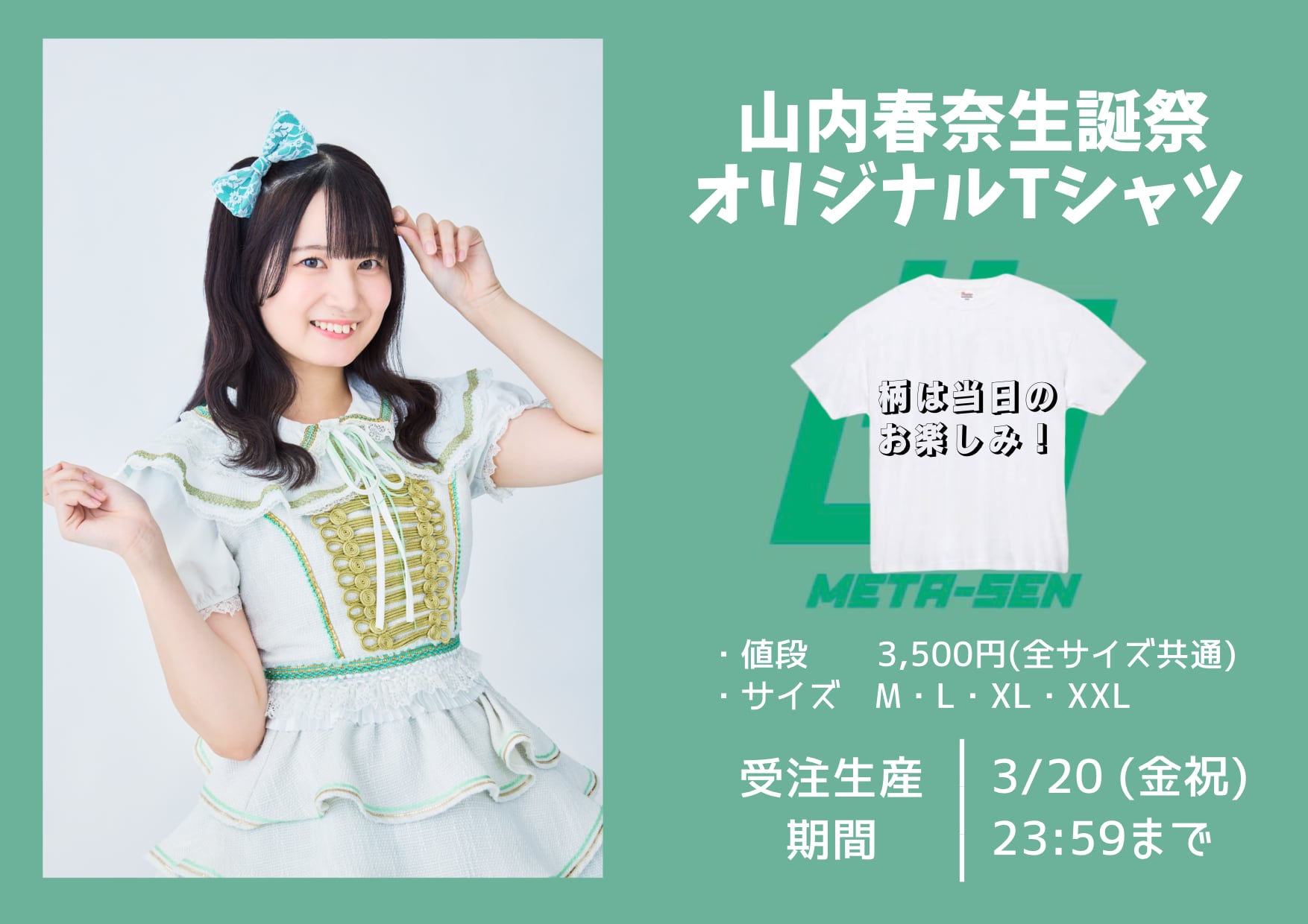 4/12(日)に開催される「山内春奈生誕祭」を記念したオリジナルTシャツの受注生産になります。
